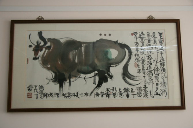 抬眼望去,韩美林先生的一幅“耕牛图”悬挂在墙壁上,上题:“老牛恋草,铁骊吾师犹恋五十余年之电影艺术”,这是韩美林先生贺谢老80岁寿辰作,弹指至今又过去了6年。一对恩爱夫妻,相濡以沫度同龄,哪里看得出是86岁的人呢?
