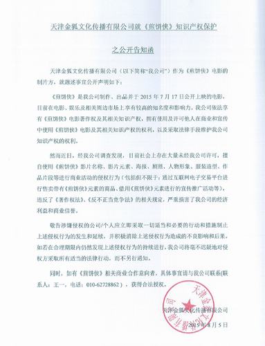 天津金狐文化传播有限公司就《煎饼侠》知识产权保护之公开告知函: