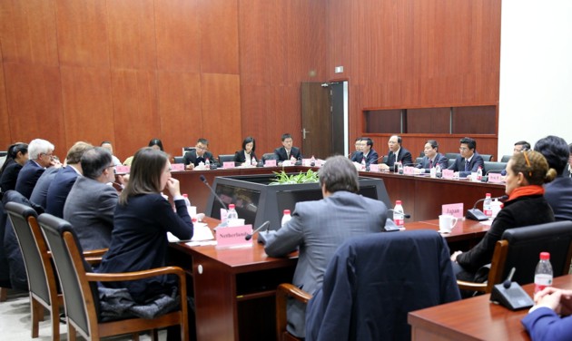 为加强对外知识产权交流合作,促进外界对中国知识产权司法保护主渠道作用的进一步了解,2015年12月1日,商务部条法司陈福利副司长率队访问北京知识产权法院,并组织邀请相关驻华使馆知识产权官员一同参访。活动采取座谈交流、实地参观等形式。商务部条法司陈福利副司长、最高法民三庭王闯副庭长、北京市高院民三庭杨柏勇庭长出席活动并致辞,北京知识产权法院宿迟院长详细介绍了有关知识产权司法改革及北京知识产权法院运作情况。中外双方人员就相关问题进行了交流讨论。座谈会后,中外双方人员一同到法庭、志愿者之家、立案大厅等进行了参观。