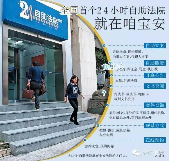 宝安区法院的24小时自助法院设立在法院大门外部,不到20平方米的区域空间,为当事人提供了法院工作8小时之外的自助诉讼服务,它集24小时自助服务终端操作区、当事人电话咨询区、自助法院视频宣传区等为一体,无需人员看守、无需工作人员在场操作。