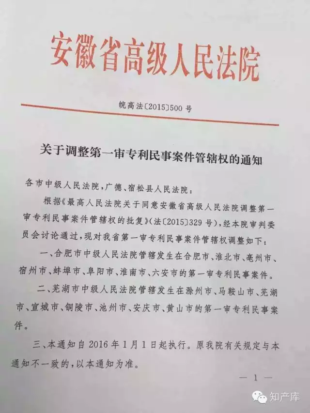 根据《最高人民法院关于同意安徽省高级人民法院调整第一审专利民事案件管辖权的批复》(法 [2015] 329号),经本院审判委员会讨论通过,现对我省第一审专利民事案件管辖权调整如下: