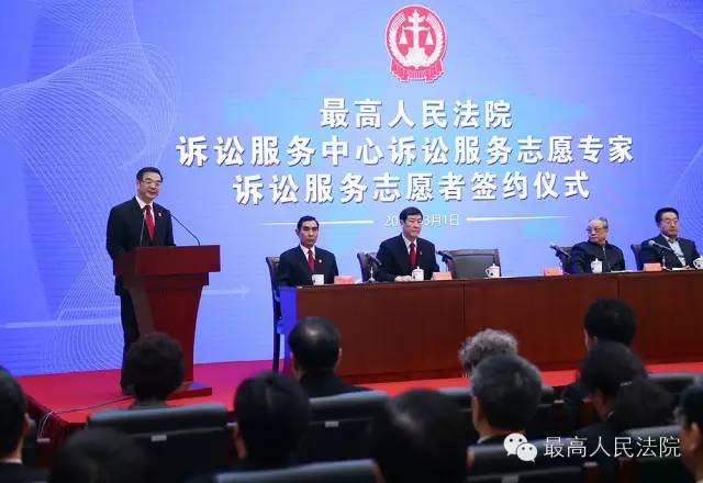 3月1日下午,最高人民法院举行诉讼服务中心诉讼服务志愿专家、诉讼服务志愿者签约活动。最高人民法院院长周强出席活动强调,要全面贯彻落实党的十八大和十八届三中、四中、五中全会精神,认真学习贯彻习近平总书记系列重要讲话精神,紧紧围绕“努力让人民群众在每一个司法案件中感受到公平正义”的目标,牢牢坚持司法为民、公正司法,不断创新诉讼服务模式,提高诉讼服务水平,让司法更加贴近人民群众,依靠全社会力量共同推进法治中国建设。