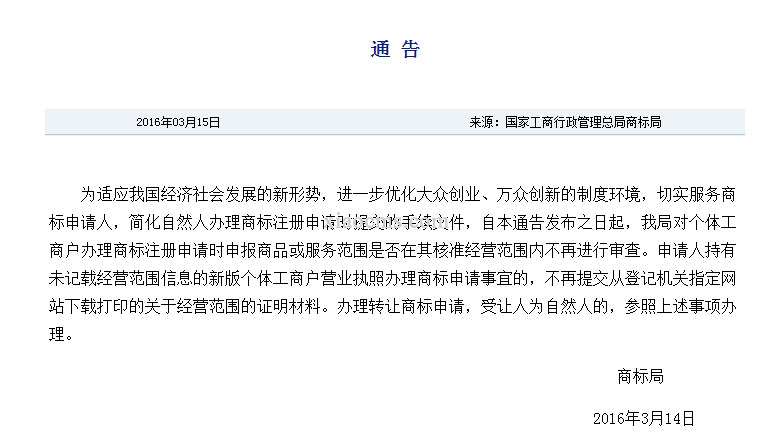 2016年3月15日,商标局下发通知书,自然人申请商标不再参考个体户范围,这个对想要申请保护自主知识产权的自然人来说,终于得到了平等的对待,得到了宽容。(附:下图为公告内容)