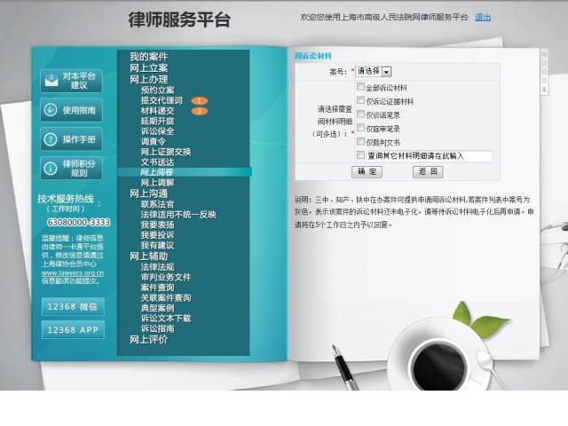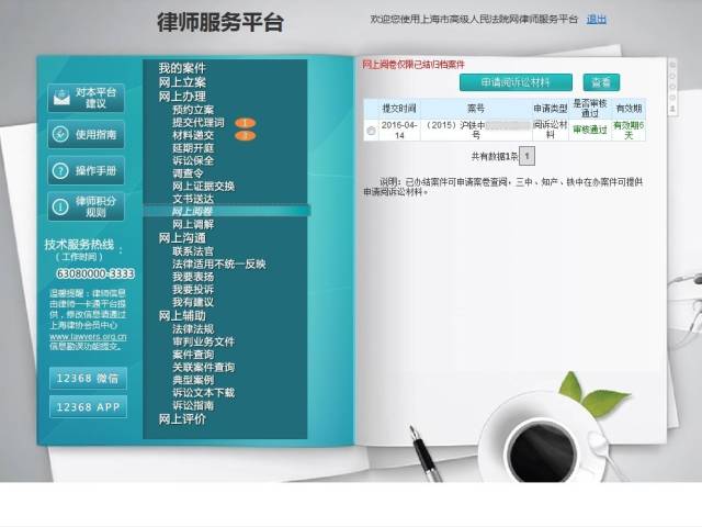 案件代理律师只要进入上海法院网律师服务平台,提出“申请阅诉讼材料”。上海三中院在收到律师网上申请后,5个工作日内通过短信或电话方式回复。律师在接到“同意”的回复通知后即可登录服务平台进行查阅,有效期为10天,超过有效期后必须重新办理申请查阅手续。法院如果回复“拒绝”的,也会注明拒绝原因。