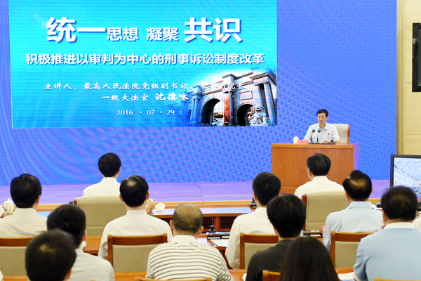 全国政法机关除正在值班执勤之外的120多万干警通过视频系统在各分会场听取讲座。在中央政法委机关主会场,最高人民法院常务副院长沈德咏以现场讲授和视频演示、讲法理和讲故事相结合的方式,从“为什么改、改什么、怎么改”三个方面,对推进以审判为中心的诉讼制度改革问题进行了深入系统讲解,生动直观地阐述了这项改革的重要意义、试点做法、实际成效,引发听众广泛共鸣。