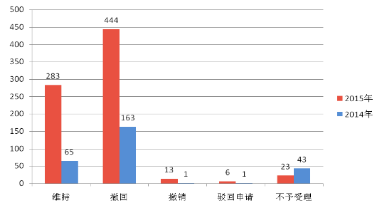 2015年度,商评委共审结行政复议案件769件,包括2014年转入案件38件和2015年新收案件已审结的731件,审结率81.5%。审结的案件中,维持被申请具体行政行为的283件,申请人撤回复议申请的444件,撤销被申请具体行政行为的13件,驳回复议申请的6件,不予受理复议申请的23件。2015年度与2014年度结案方式、数量对比情况见下图: