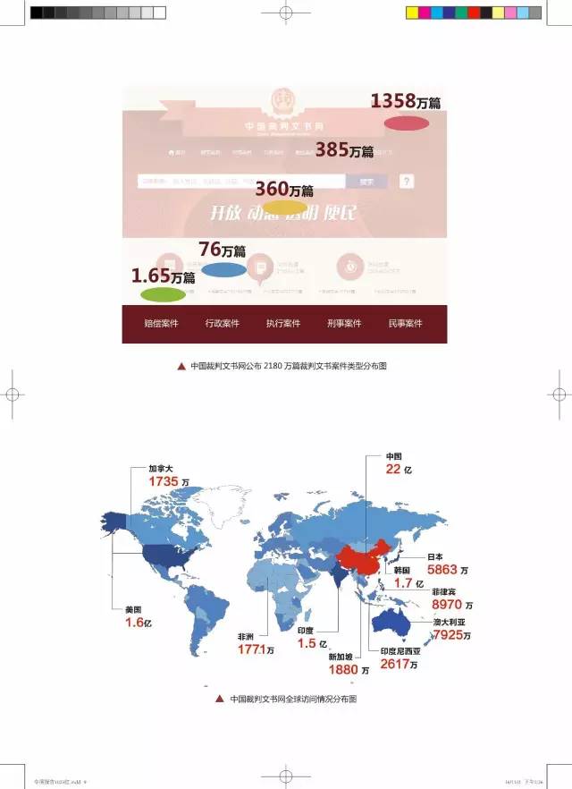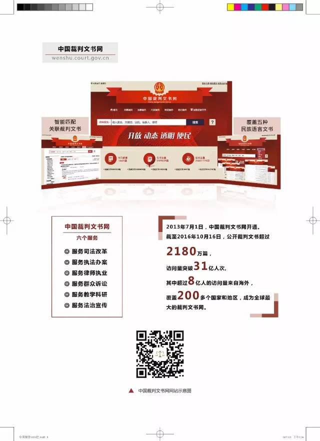 建设裁判文书公开平台。开通中国裁判文书网,除涉及国家秘密、未成年人犯罪、以调解方式结案、离婚诉讼或涉及未成年子女抚养等情形外,各级法院作出的裁判文书统一在中国裁判文书网公开。不断完善网站功能,增加公开蒙、藏、维、朝鲜和哈萨克等5种民族语言裁判文书,提供全网智能化检索服务,更好地满足各界群众对裁判文书的多样化需求。截至今年10月16日,中国裁判文书网公开裁判文书超过2180万篇,访问量突破31亿人次,其中超过8亿人次的访问量来自海外,覆盖200多个国家和地区,成为全球最大的裁判文书网。