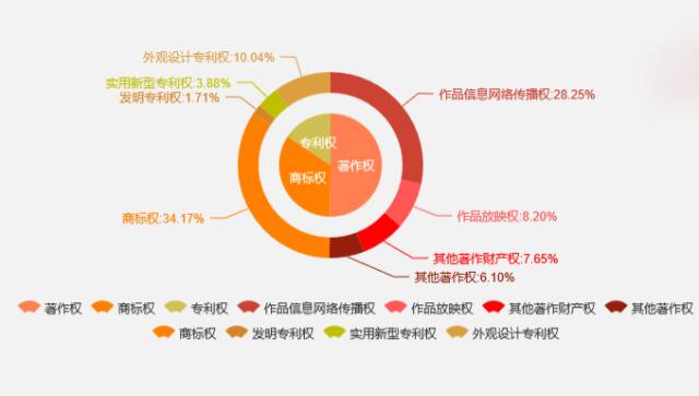 2015年1月1日至2016年12月31日,全国知识产权案件量呈上升趋势,2016年较之2015年同比上升41.34%。案由分布情况如下图所示,著作权侵权案件量占50.20%,其中以作品信息网络传播权侵权为主;商标权侵权案件量占34.17%;专利权侵权案件量占15.63%,其中外观设计专利权案件最多。