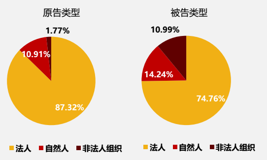 在知识产权侵权案件中,原被告均以法人为主。其中,法人占全部原告的87.32%,占全部被告的74.76%。被告中超八成法人或非法人组织的单位性质为有限责任公司。被告中超八成自然人身份为私营企业主、个体劳动者。