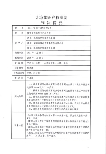 2018年4月,北京知识产权法院开庭审理来电科技诉被告湖南海翼、街电侵害实用新型专利权纠纷。开庭审理的两个案件分别涉及来电科技拥有的两项实用新型专利:专利号ZL201520847953.1,名称为“移动电源租用设备及充电夹紧装置”的实用新型专利;专利号ZL201520103318.2,名称为“吸纳式充电装置”的实用新型专利。