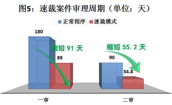 ——简易案件快速审理,及时回应救济诉求。积极应对案件增长态势,对于事实清楚、权利义务明确、争议不大的知识产权简易案件,全面推行快速集中审理模式,加快立案、卷宗移交、送达工作,灵活安排开庭时间和地点,庭审程序可不区分法庭调查、法庭辩论阶段直接进行质证、焦点辩论等实质性审理。全年采用速裁模式审结知识产权简易案件一审8832件,二审2154件。一审平均审理周期89天,比采用正常程序审结案件缩短91天,二审平均审理周期34.8天,比采用正常程序审结案件缩短55.2天。有效地支持权利人快速维权,强化司法救济的及时性和有效性,切实满足权利人的正当保护需求。