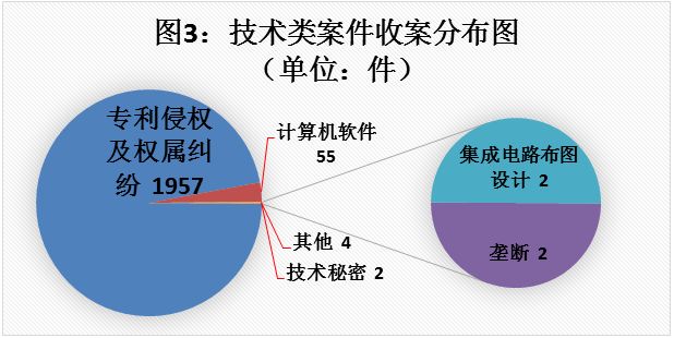 ——聚焦技术类案件,保障创新驱动发展。知识产权通过技术转化运用可以形成先进生产力,这是推动我国供给侧结构性改革,提升国际竞争力的必然选择。人民法院通过司法审判,保护创新型技术成果,是落实国家创新驱动发展战略的关键助力。2017年,新收专利、计算机软件等技术性较强的案件2018件,同比增长2.48%,其中新收专利侵权及权属纠纷1957件,占该类型案件总量的96.97%。审结2291件,同比增长69.32%。其中专利侵权及权属纠纷2229件,同比增长73.59%。通过依法审理,准确定性,支持权利人维权,有效保护和激励企业与个人持续创新创造的积极性,为大众创业、万众创新保驾护航。