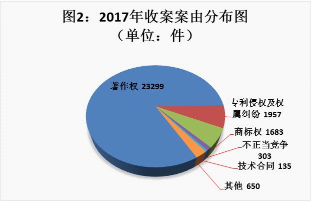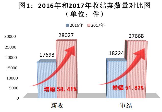 ——公正高效审结各类知识产权案件。2017年,全市法院受理的知识产权案件再呈爆发式增长,收结案数再创历史新高。全年新收知识产权(民事、刑事、行政)案件28027件,同比增幅58.41%。其中新收民事一审案件23607件,同比增幅为63.55%,超过全省收案数的三分之一,全国收案数的十分之一。审结各类知识产权案件共计27668件,同比增幅51.82%。其中审结一审民事案件23508件,同比增幅57.91%。