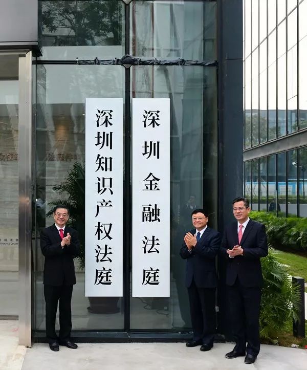 最高人民法院院长周强,广东省委常委、深圳市委书记王伟中,广东省委常委、政法委书记何忠友一同为深圳知识产权法庭揭牌。