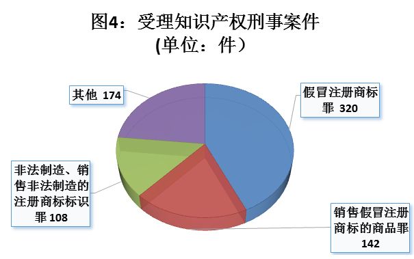 ——依法严惩侵犯知识产权犯罪,构建守法经营尊重知识产权的市场秩序。全年受理知识产权刑事案件744件,其中一审632件。审结知识产权刑事案件634件,其中一审537件。共判处1220人有罪,判处罚金10334.62万元。坚持刑事制裁与经济惩处相结合,适用主刑的同时,高度重视财产刑的适用,从经济上剥夺犯罪分子再次犯罪的能力和条件,有力震慑侵犯知识产权犯罪行为。如深圳中院审结的被告人莫某某等9人假冒注册商标罪案,法院认定莫某某等9人非法制造假冒“”“VACHERON CONSTANTIN”“PIAGET”等世界知名商标的手表,非法经营数额达216.264万元,据此认定各被告人构成假冒注册商标罪,判处各被告人刑期不等的有期徒刑和金额不等的罚金刑,对其中的主犯莫某某,法院根据其在全案犯罪实施过程中的作用,在判处有期徒刑四年外,并判处罚金人民币110万元,彰显了法院对侵犯社会主义市场经济秩序的知识产权犯罪行为之“零容忍”态度。