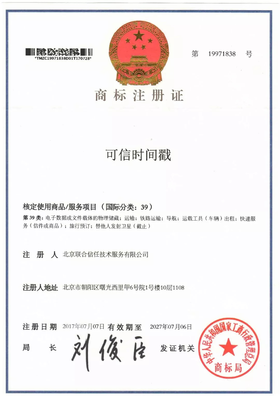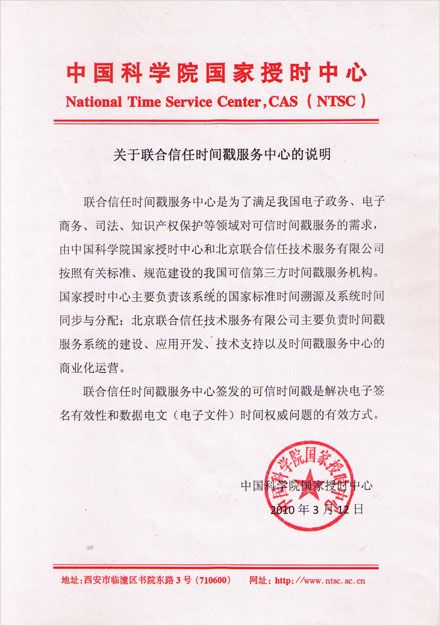 可信时间戳®是北京联合信任技术服务有限公司的专属商标。