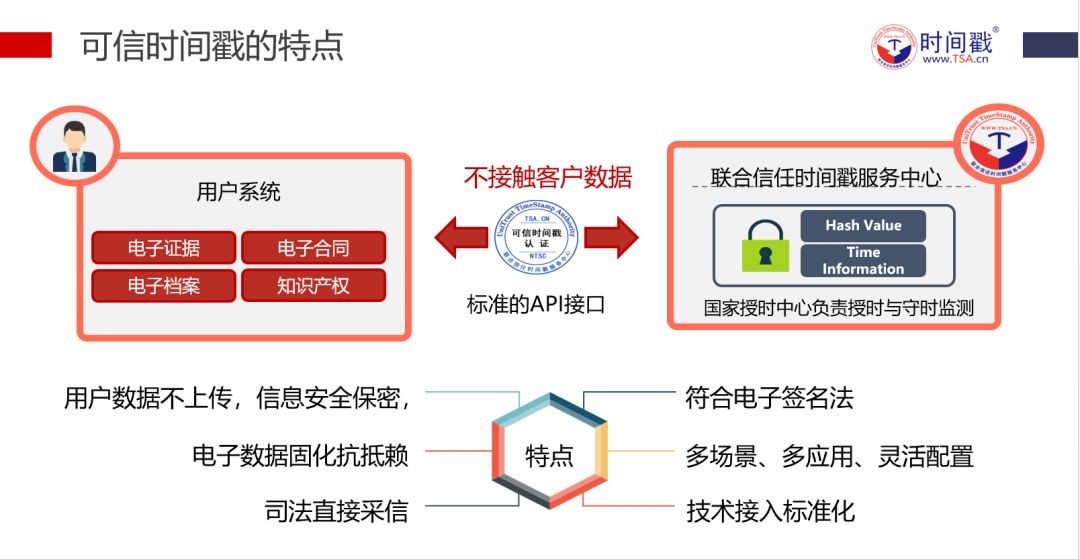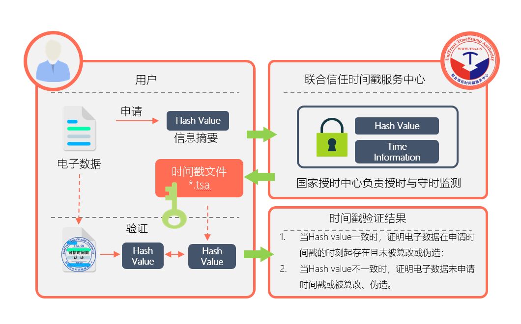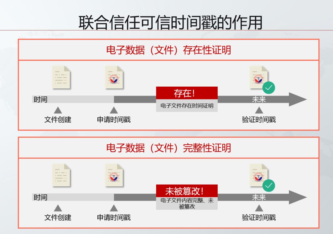 可信时间戳的主要作用是以联合信任时间戳服务中心(TSA)作为可信任的第三方,证明电子数据文件的存在性和内容完整性。解决了电子数据文件在事后举证难的问题。