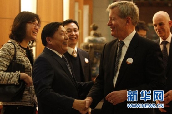 2月9日,国家网信办主任鲁炜(前左)与美国驻华大使马克斯·鲍卡斯握手寒暄。当日,国家互联网信息办公室在北京钓鱼台国宾馆举行2015年新春招待会,来自79个国家的135位驻华使节,60多位外国企业、媒体和机构代表,及有关部门负责人出席。新华社记者 邢广利 摄